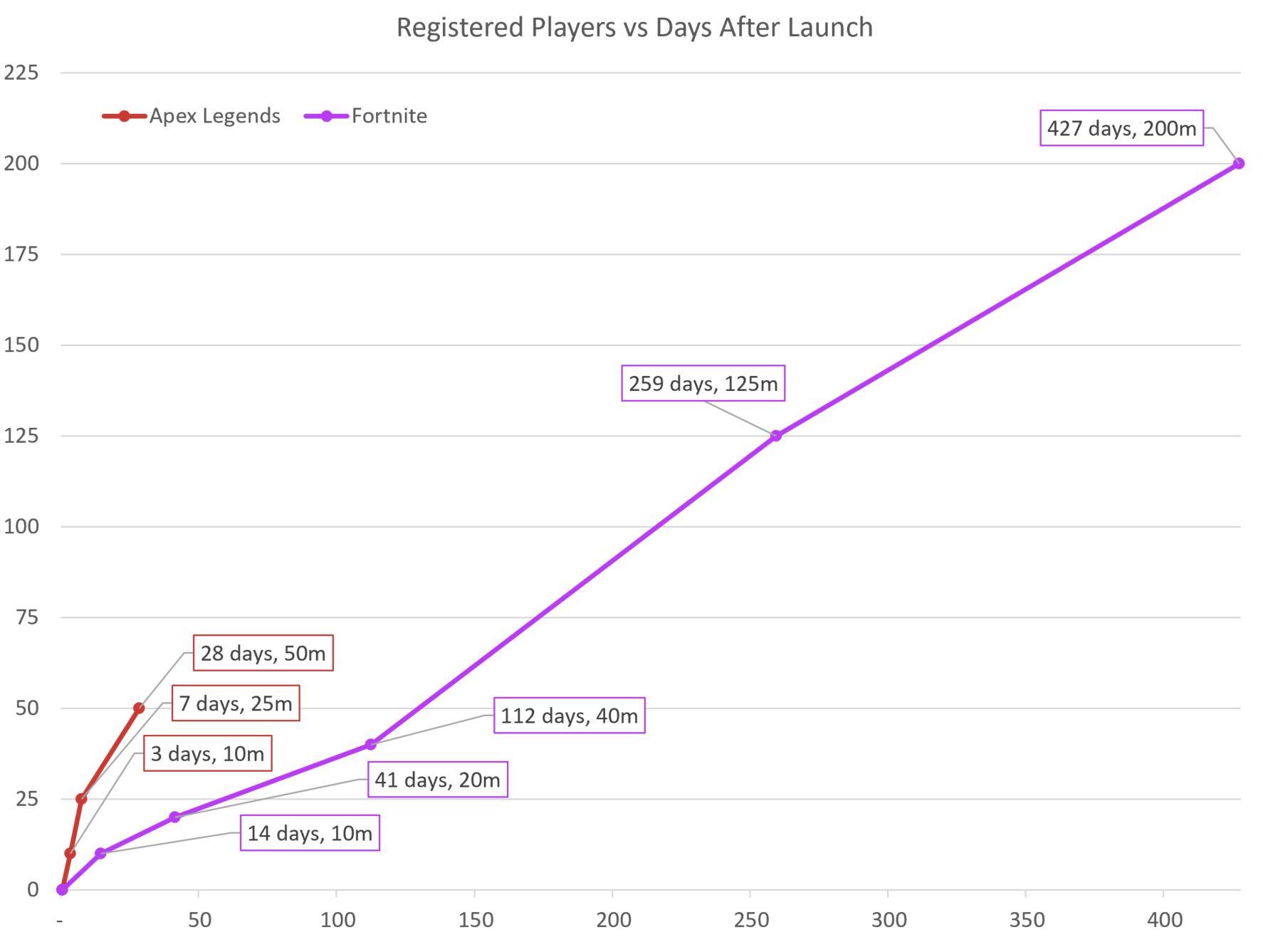 Adicionalmente Thomas Rice, analista de mercado, compartió datos adicionales de este logro. Apex Legends obtuvo 27 millones de jugadores en su primera semana, a diferencia de Fortnite que logró 20 millones en 41 días.