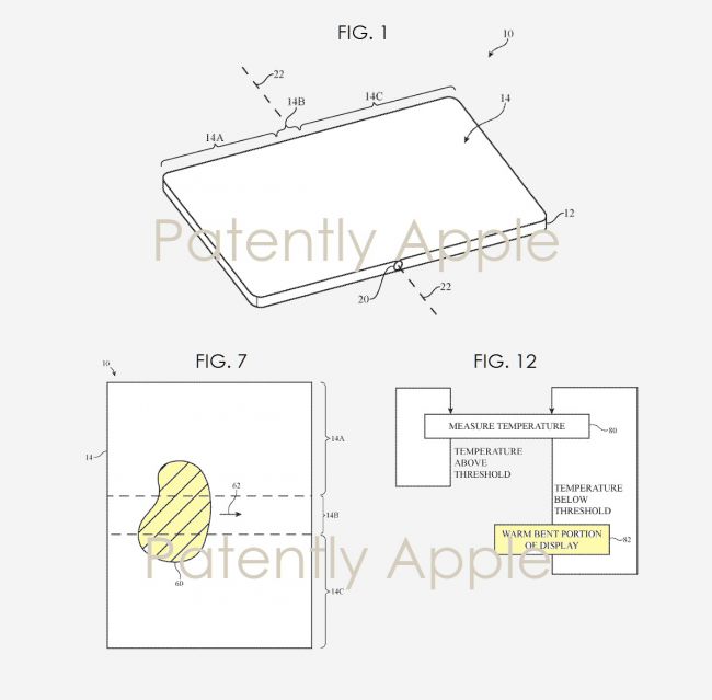 La patente titulada “Dispositivos Electrónicos con pantallas flexibles” muestra un sistema de temperatura para pantallas plegables. Aparentemente esto se usaría para evitar que la pantalla se quiebre por culpa del frío.