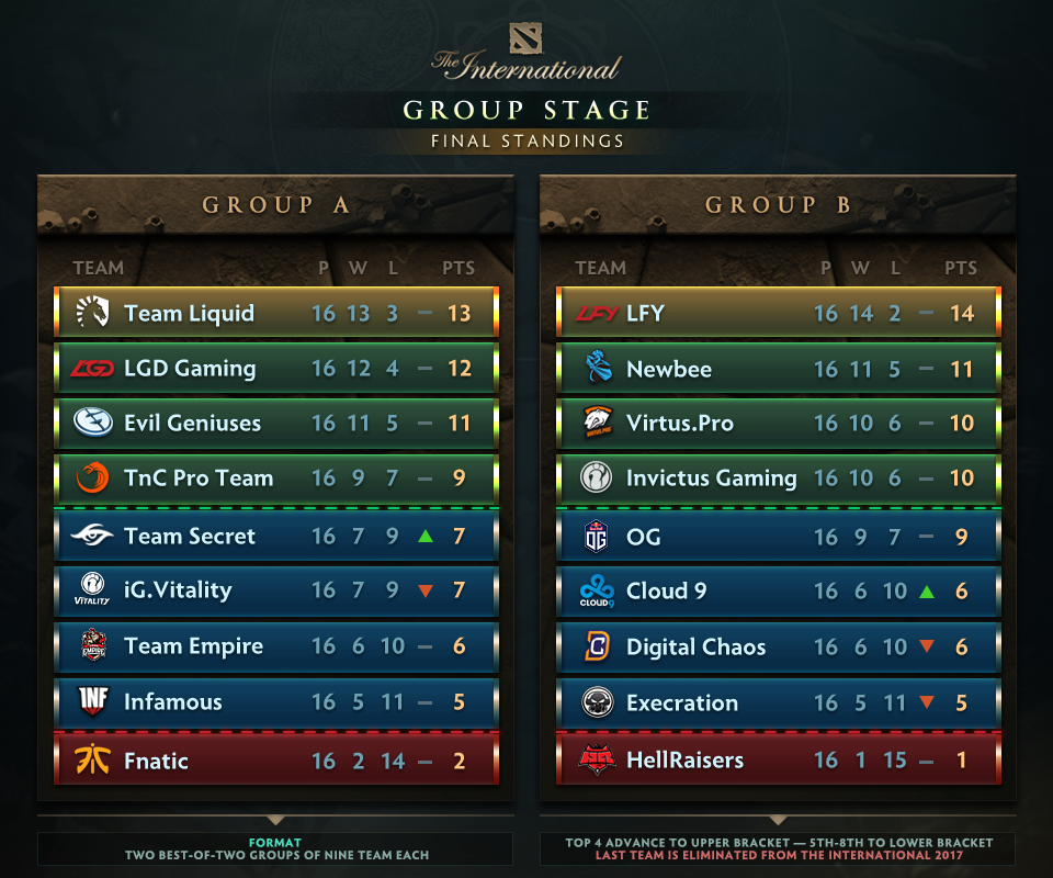 Después de 4 intensos días de partidas en la fase de grupos, por fin se definió la posición de los equipos para el torneo. Tanto Fnatic, como HellRaisers fueron eliminados del torneo por quedar últimos en sus grupos y se llevan a casa más de $59,000. El equipo peruano Infamous Gaming logró clasificar, convirtiéndose en el primer equipo latinoamericano en llegar hasta la siguiente etapa.