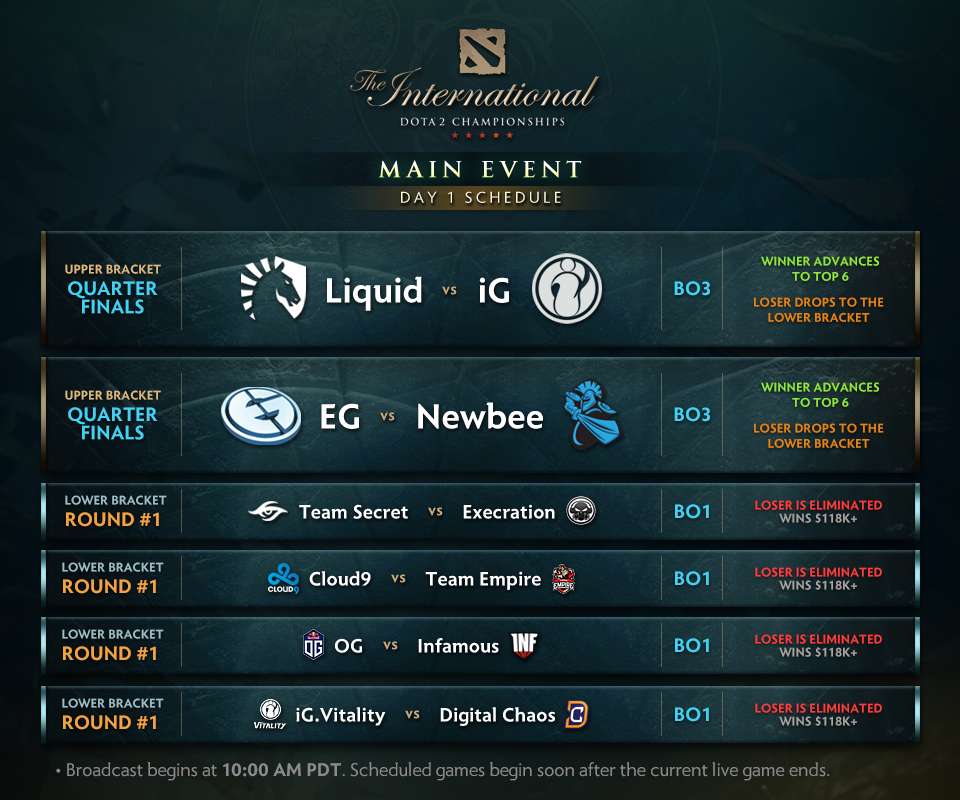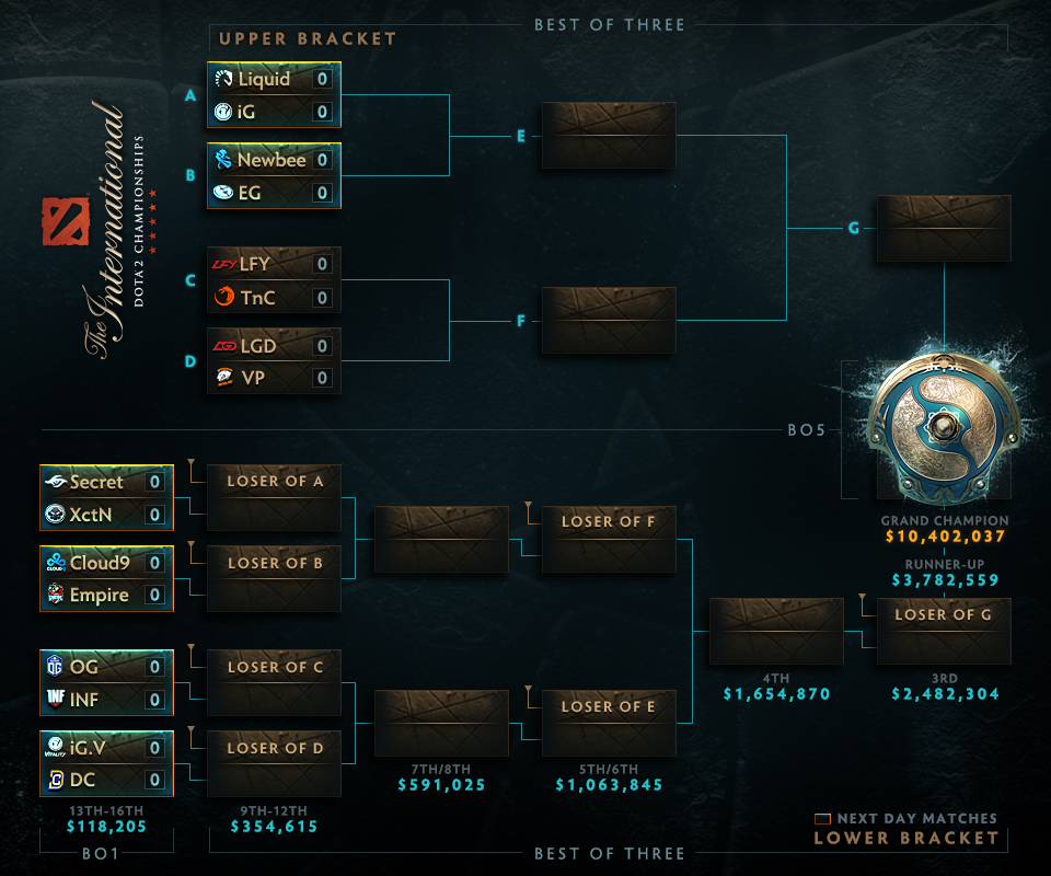 Sin embargo, los equipos con menos puntos (lower bracket) tendrá solo una oportunidad para pasar a la siguiente etapa. Durante el primer día, los equipos que pierdan su primera partida serán eliminados y se llevarán a casa $119 mil dólares. La gran final se llevará a cabo el sábado 12 de agosto y el campeón se llevará a casa más de US$10,4 millones de dólares