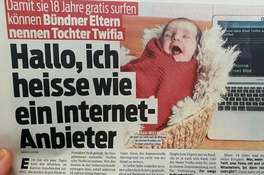 Una singular historia acaba de reportarse en Suiza. Una pareja de padres decidió bautizar a su hija con el nombre de una operadora de internet local llamada Twifi para aprovechar una singular oferta. La compañía lanzó una campaña para promocionar su reciente llegada al país ofreciendo internet gratis por 18 años a los padres que bauticen a sus bebés recién nacidos con los nombres Twifus (en caso de ser niño) o Twifia (en caso de ser niña).