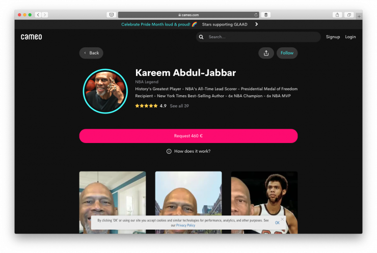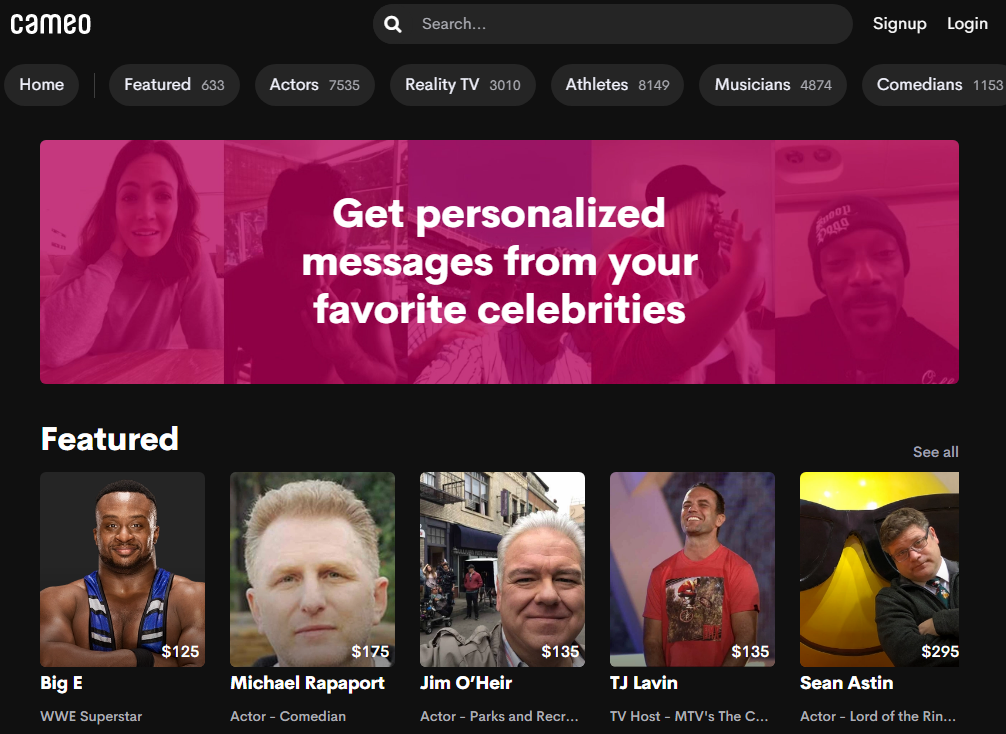 Cameo es una página web en donde podrás contactarte con tu celebridad favorita y recibir un saludo o incluso una videollamada. Eso sí, tendrás que pagar para este contacto, y las celebridades disponibles son las que han firmado con la empresa.