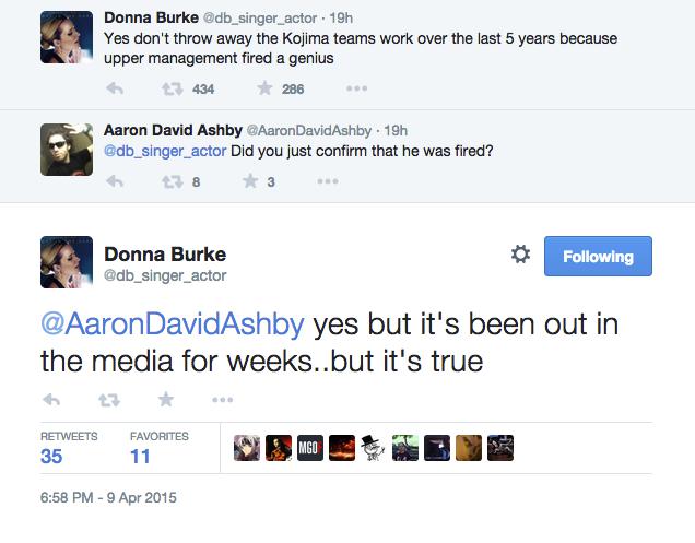 Volver a "Cantante que trabaja en Metal Gear Solid V afirma que Kojima ha sido despedido de Konami"