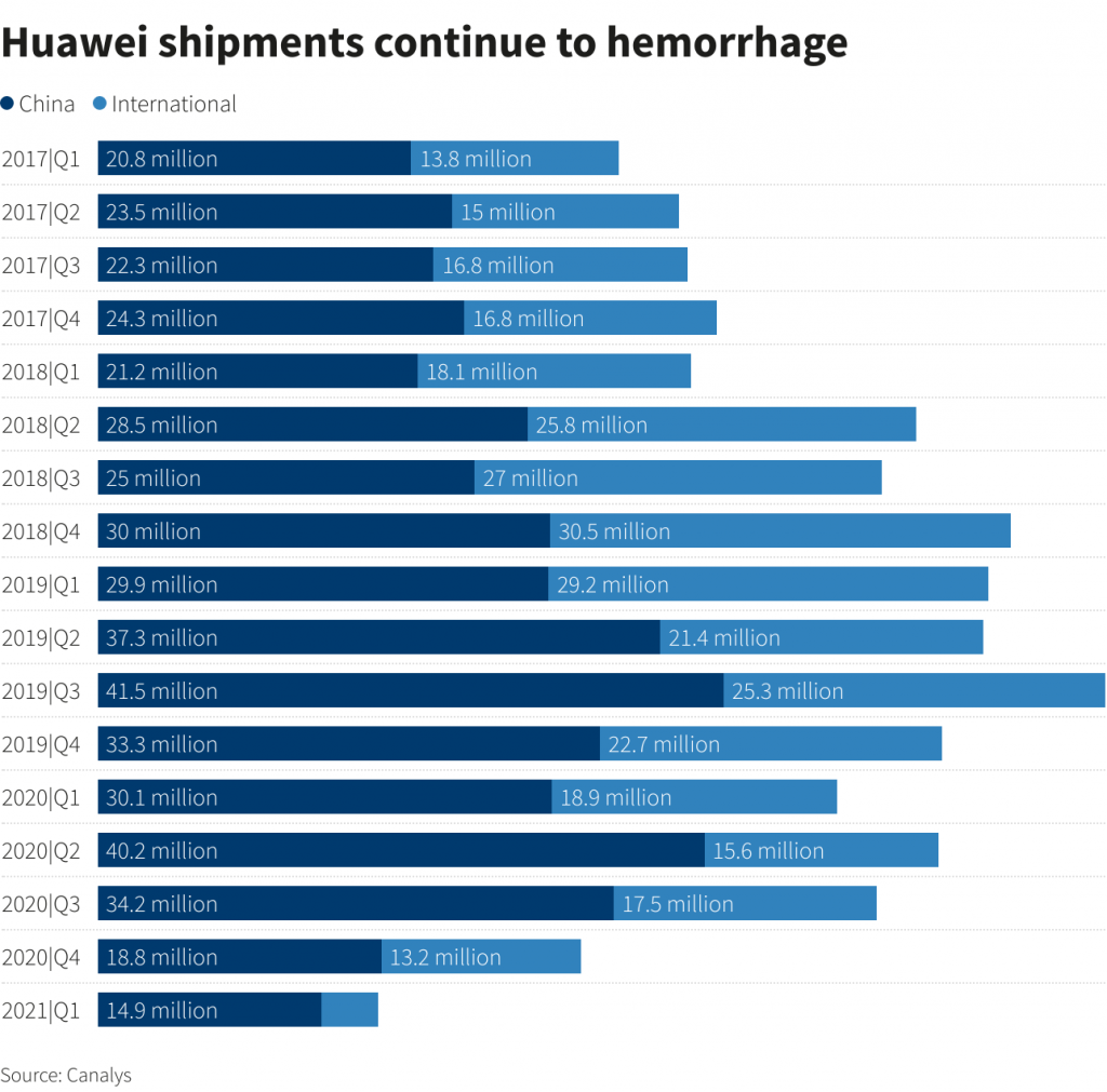 Los resultados de envíos de teléfonos son bastante alarmantes mostrando una espectacular caída el último tramo del 2020 e inicios del 2021. El veto de Estados Unidos, impuesto por Trump y mantenido por Biden, ha imposibilitado a Huawei a poder acceder a cientos de chips y diseños necesarios para poder seguir produciendo nuevos equipos smartphones. Huawei se encuentra en una situación en la cual tiene que pensar cuál será su hoja de ruta a seguir en el futuro.