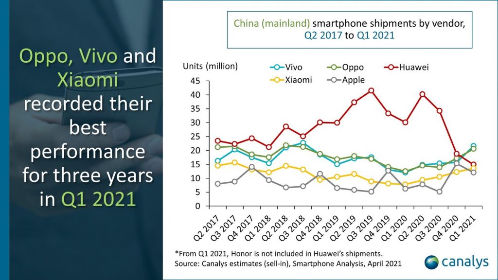 Mientras que Huawei baja, Vivo y Oppo han ascendido colocándose en los primeros puestos. Mientras tanto, Xiaomi está próximo a superar y hasta Apple que tiene un menor ingreso de mercado. La caída de Huawei va de un 41% el pasado a un 16% ahora en cuota de mercado. Por otro lado, Vivo y Oppo crecieron extraordinariamente con un 79% y 65% respectivamente.