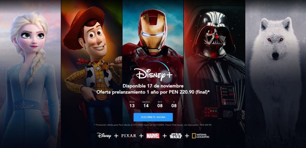 Para celebrar la llegada a nuestro país, Disney Plus lanza su primera promoción de prelanzamiento con una suscripción anual de 220 soles, aproximadamente 18.30 soles mensuales. Paga ahora y disfruta del servicio desde el próximo 17 de noviembre en nuestra región, además de descargas ilimitadas en 10 dispositivos sin ningún tipo de anuncios.