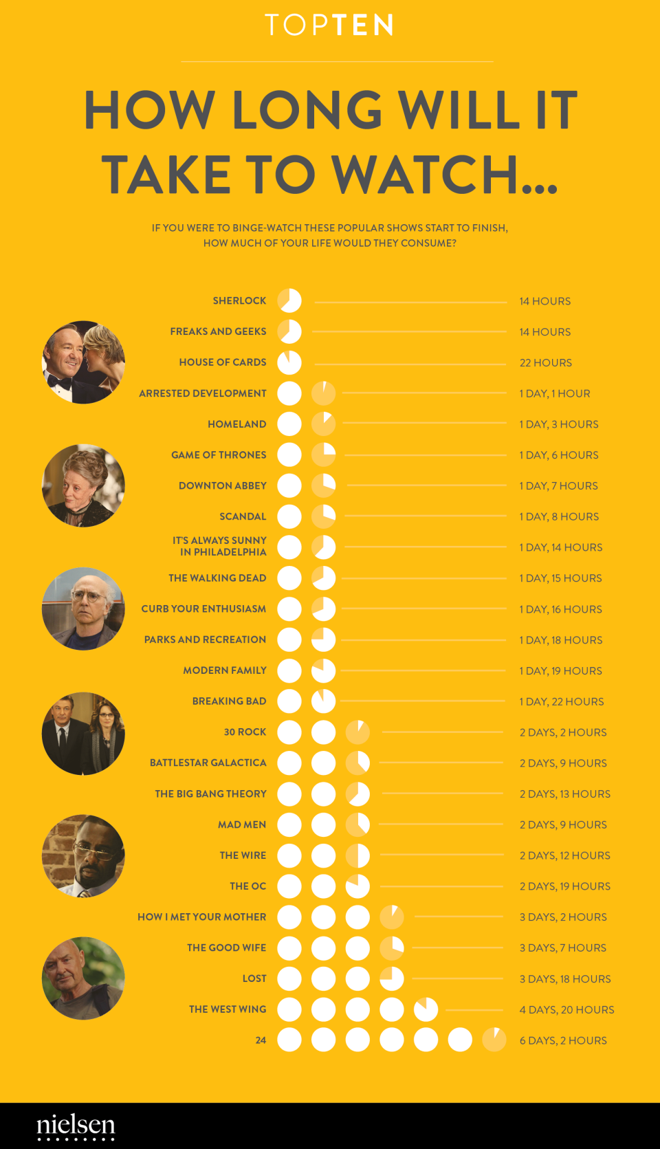 Es por eso que el portal Top Ten ha publicado esta infografía que muestra cuanto te demorarías en ver todos los capítulos emitidos hasta la fecha de muchas de las series más populares de los últimos tiempos: