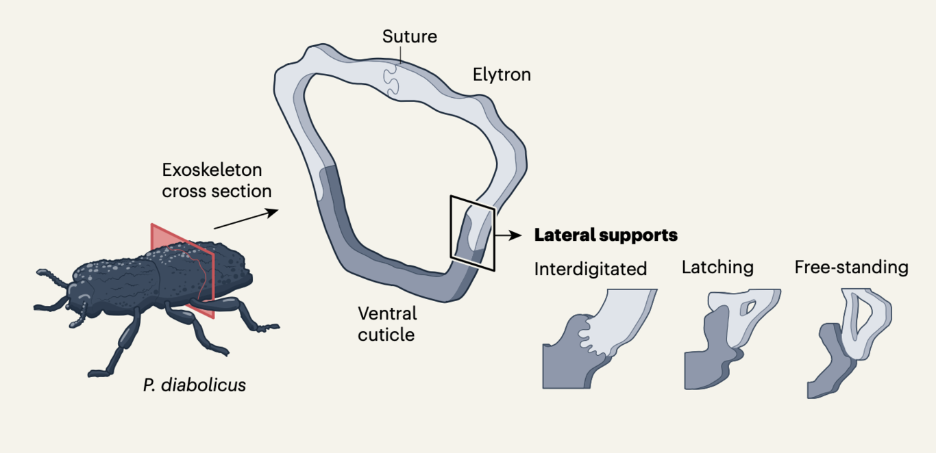 Sucede que los protagonistas de la resistencia de su caparazón son los élitros, o sea las alas delanteras exoesqueléticas del animal. Gracias a la microscopía avanzada, y distintas pruebas, se observa que todo es cuestión de la geometría y los entrelazados mecánicos que tiene este caparazón.