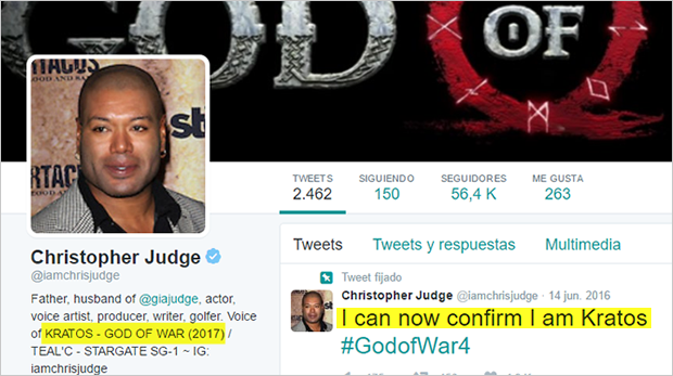 ¿Qué tan pronto? Según Judge, no habría que esperar mucho. En su cuenta de Twitter el actor no sólo confirmó que dará voz al protagonista, sino que además actualizó su perfil de la red social y dio fecha a la salida del juego: “God of War (2017)”.
