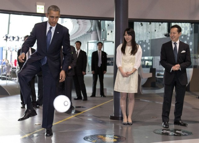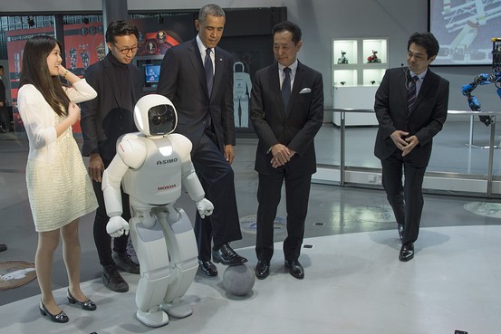 El presidente Barack Obama estuvo en Japón esta semana y tuvo la oportunidad de conocer al robot humanoide llamado ASIMO (Advanced Step in Innovative Mobility), fabricado por Honda Motor Co. La fluidez de sus movimientos sorprendió al mandatario con el que intercambio algunos toques de pelota. Aquí el video: