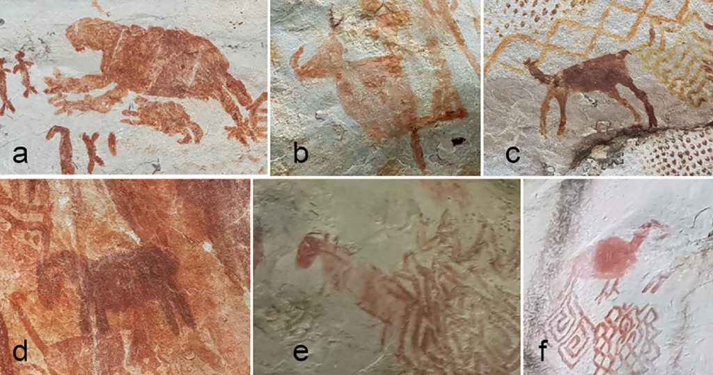 Lo más sorprendente y extraño es la aparición de animales extintos de la era de hielo como mastodontes, perezosos, camellos gigantes y muchos más debido a que no son muy comunes en pinturas rupestres de este continente. Se han aislado un total de 12 paneles que fueron pintados con pigmentos minerales rojizos.
