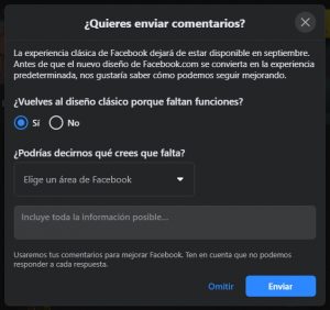 Actualmente, la opción sigue disponible, pero tiene un mensaje. En él, nos avisa que la versión clásica dejará de estar disponible desde setiembre. Asimismo, sabemos que la red social busca mejorar nuestra experiencia, pues también nos hace la siguiente pregunta: “Vuelves al diseño clásico porque faltan funciones?”. En caso de poner “Sí”, nos pregunta por algo que le falte y nos da un cuadro para incluir toda la información posible. De lo contrario, si marcamos “No”, tan solo nos pregunta por qué queremos volver al diseño anterior.
