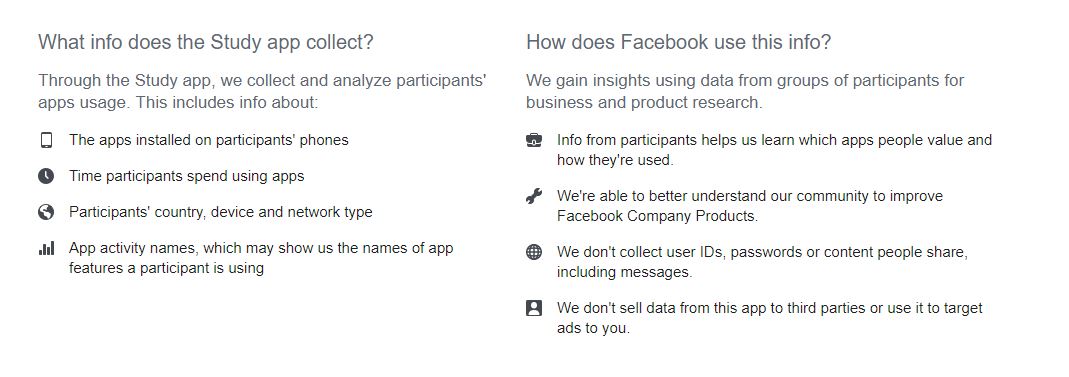 La red social de Mark Zuckerberg afirma que quieren esta recopilación de información para mejorar sus productos y que no guardará ningún tipo de ID de usuario, contraseñas, mensajes o cualquier otro contenido que se pueda compartir. De momento no hay detalles de cuánto dinero se dará a los que participen de Study ni cuándo será su fecha de lanzamiento.
