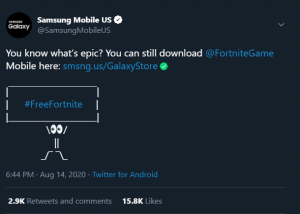 ¿Sabes qué es épico? Aún puedes descargar Fornite para teléfono…”, es lo que dice el tweet de Samsung, dejando, asimismo, un enlace directo para descargar el Launcher de Epic Games desde la Galaxy Store, el cual permite descargar Fortnite y otros títulos de la desarrolladora. Además de esto, acompañando estas palabras, hay un muñeco sujetando un cartel con el mensaje #FreeFortnite, hashtag que Epic pidió que sus seguidores usaran en modo de protesta.