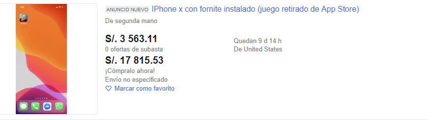 En distintas páginas de ventas se han evidenciado dispositivos (iOS) con Fortnite ya instalado a un precio exorbitante. Desde 8,900 soles por un iPhone XS de 64 GB, hasta un iPhone X Pro a 15,472 soles, todo únicamente por asegurarte que tienen este battle royale en su disco duro.