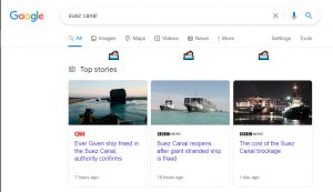 Para verlo, lo único que debe hacerse es entrar a Google y buscar «Suez Canal»; en caso de hacerlo en español, ‘Canal de Suez’, no resultará. Una vez apretado enter, no solo veremos las recientes noticias y páginas que hablan del tema; si no, también encontraremos unos pequeños barquitos que navegan en la parte superior de los resultados.