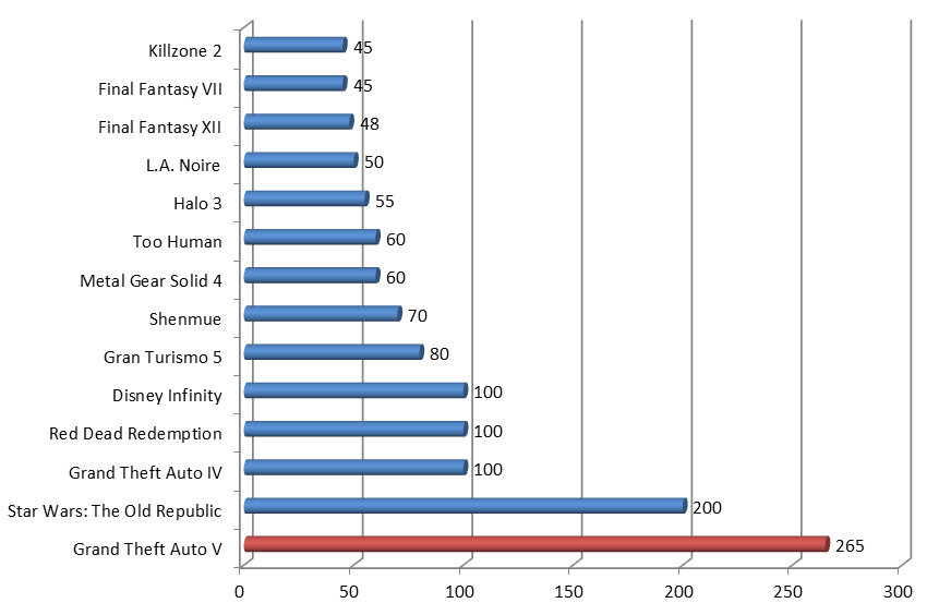 Según reportes, la última entrega de la saga de Grand Theft Auto habría costado más de US$265 en producir y promover. Esto lo pone en la cima de los juegos más costos de la historia. Más increíble aun es que solo con las pre ordenes Rockstar ya recuperó su inversión (sin contar las ventas que tendrá cuando se lance.)