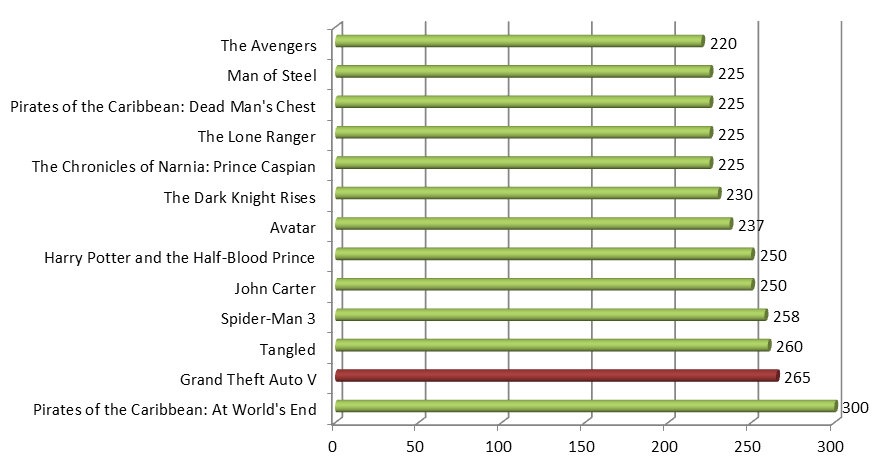 Según reportes, la última entrega de la saga de Grand Theft Auto habría costado más de US$265 en producir y promover. Esto lo pone en la cima de los juegos más costos de la historia. Más increíble aun es que solo con las pre ordenes Rockstar ya recuperó su inversión (sin contar las ventas que tendrá cuando se lance.)
