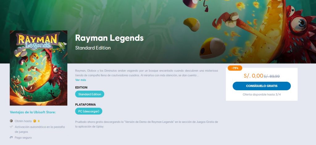 Uno de los mejores juegos de plataformas está disponible de manera gratuita por tiempo limitado. Rayman Legends está siendo regalado en la plataforma de Uplay, la tienda digital de Ubisoft, hasta el día 3 de abril. Reclama el juego desde el aplicativo o la web y será tuyo para siempre.