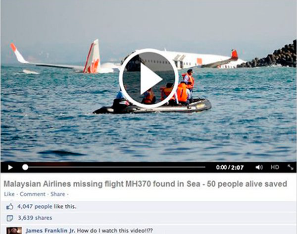¡Cuidado! en la red social Facebook se está difundiendo una noticia falsa acerca de la misteriosa desaparición del avión del vuelo MH370 de Malaysian Airlines.