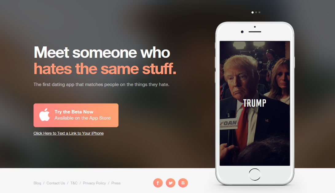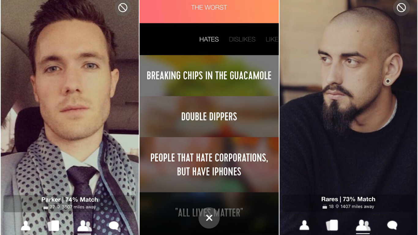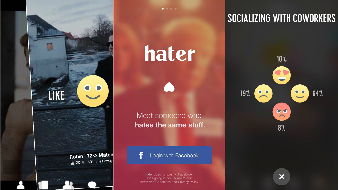 Hater es una nueva aplicación que tiene el mismo fin pero con una ejecución distinta ya que va a localizar parejas en base a lo que odien. Al registrase, los usuarios tendrán que navegar por una serie de ideas y seleccionar aquellas que más odian.