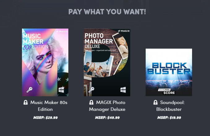 Por el siguiente grupo sí tendrás que abandonar varias monedas adicionales, ya que su coste es de 18.72$. Pero los programas que recibirás sobrepasan por mucho ese precio: Xara Photo & Graphic Designer (59,99$), MAGIX Photostory Deluxe (69.99$) y Music Maker Hip Hop Beat Producer (29.99). Nuevamente dedicados a la composición de música, en este caso de género Hip Hop. Y por supuesto, edición profesional de fotografía y diseño.