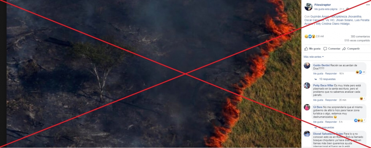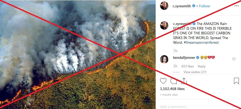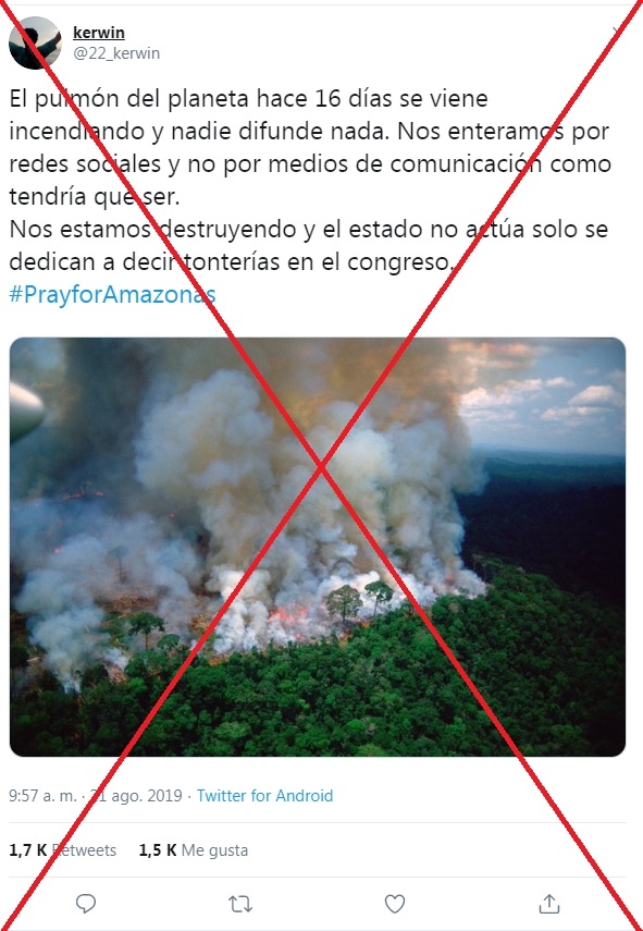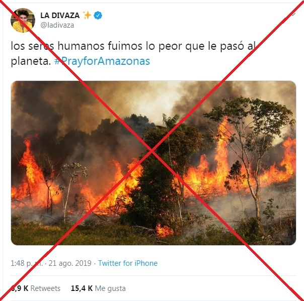 Esta fotografía en donde se evidencia gran parte de un bosque quemado, salvo un único árbol, ha recorrido el mundo entero como si fuese reciente. Sin embargo, data del 2017, y fue tomada por Bruno Kelly en la Operación Ola Verde. Su ubicación fue en una locación ficticia, es decir, se trata de un incendio controlado; el cual fue realizado por el Instituto Brasileño de Medio Ambiente y Recursos Naturales Renovables (IBAMA).