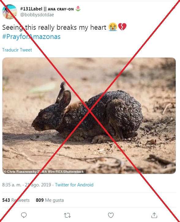 Otra de las capturas viralizadas por la catástrofe que ataca a animales indefensos, es la de este pequeño conejo con quemaduras severas en todo su cuerpo. Y aunque no pertenezca a la Amazonia, si no a un incendio ocurrido Woolsey (California); definitivamente te lleva a las lágrimas una injusticia como ésta.