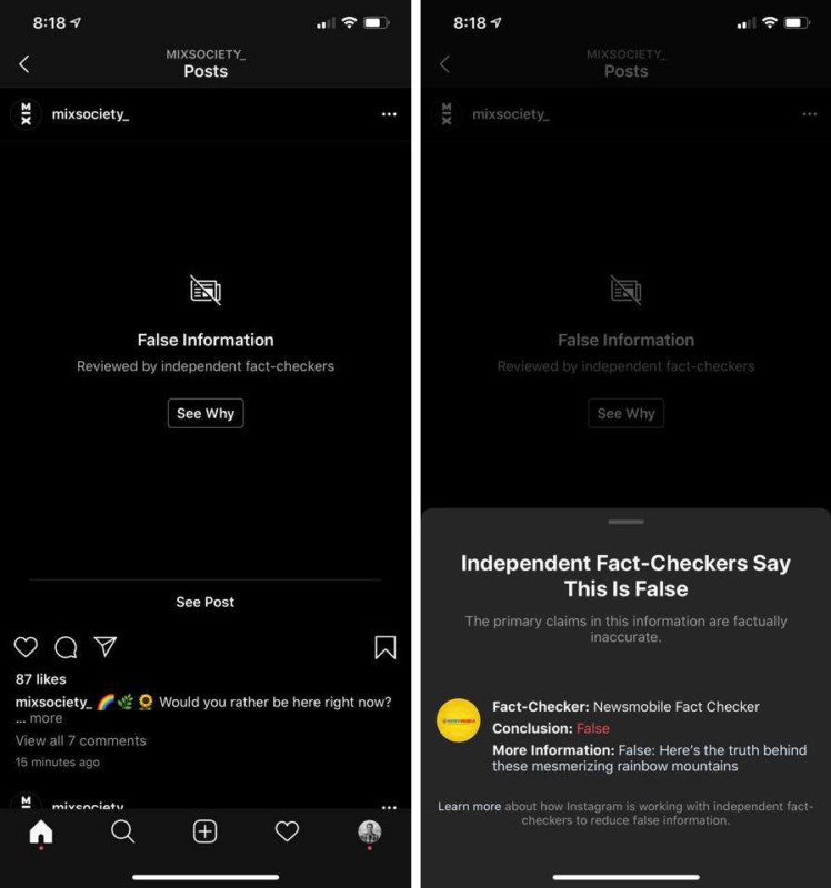 Uno de los primeros usuarios en reportar esto fue Toby Harriman, quien fue sorprendido al ver sus fotografías de montañas con color de arcoíris fueron calificadas por Instagram como información falsa o errónea.
