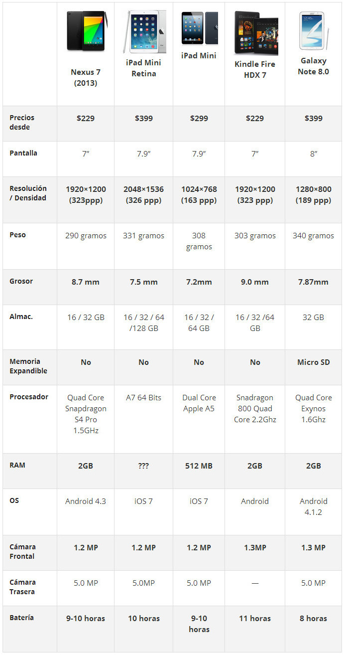 iPad mini Retina vs Nexus 7 vs Galaxy Note 8 vs Kindle Fire HDX – Guerra de Tablets (Especificaciones)