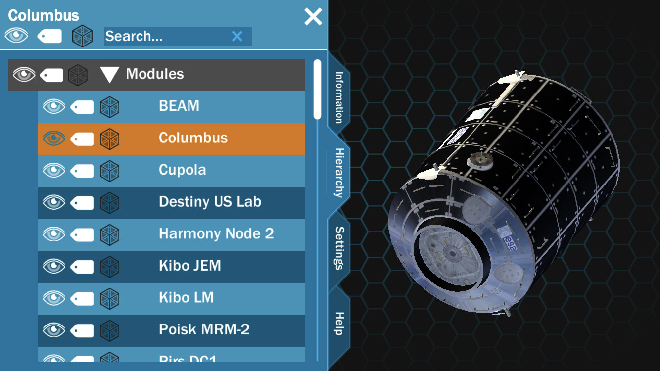 Además, esta no es la única pestaña de este apartado. También encontraremos una llamada ‘Hierarchy‘ (Jerarquía); con la cual podremos ver todos los módulos e instrumentos de la ISS, e incluso podremos seleccionar cuáles de ellos serán visibles en la app para facilitar el aprendizaje sobre esta maquinaria.