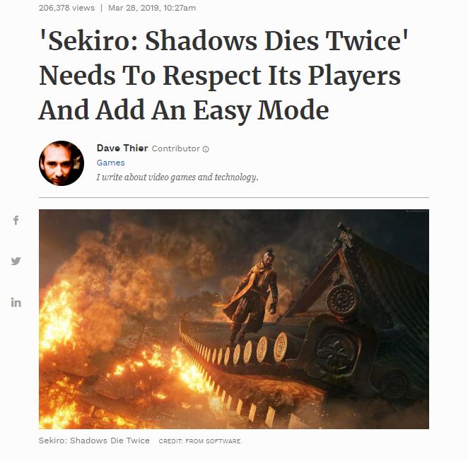 La semana pasada el portal Forbes publicó un artículo, de autoría del colaborador Dave Thier, el cual afirmaba que el retador videojuego Sekiro: Shadows Die Twice necesitaba un modo fácil para “respetar a sus jugadores.” Las reacciones en Internet no tardaron en salir a luz, criticando esta opinión al punto que otro redactor de la misma web Forbes tuvo que publicar otro artículo en oposición al de Dave.