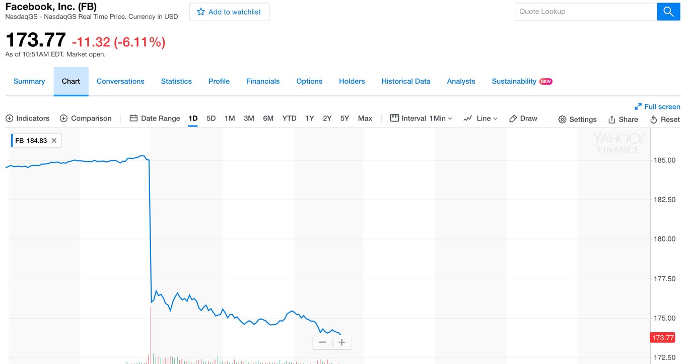 DaTEC: Desde que el mundo se enteró sobre este caso, las acciones de Facebook han ido decayendo. La cifra más dolorosa fue -6.11% en comparación con el día anterior.