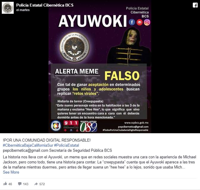 La Policía Cibernética Estatal de Baja California Sur, México ha decidido emitir una publicación alerta del popular meme. Especifican que “El Ayuwoki” no tiene nada de sobrenatural, ademas señalan que la práctica del “Challenge” podría ocasionar pánico y ansiedad. El post explica con fuentes la falsedad de este meme e incluso nombran a su rival “El Eoo” en referencia a Freddy Mercury.