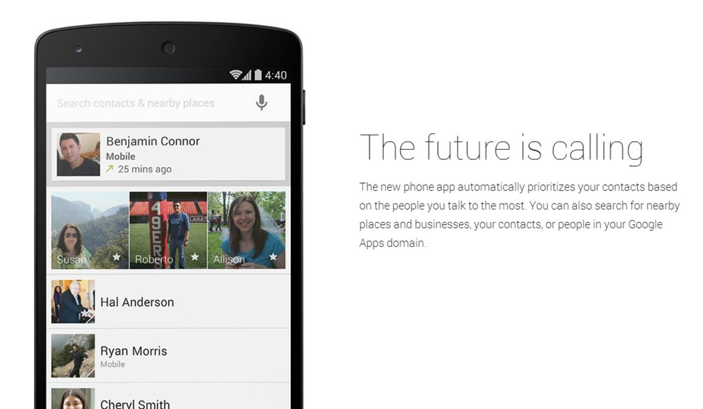 En KitKat te permite adivinar el nombre y la ubicación en Google Maps de las llamadas entrantes de los números que no tengas guardados en tu lista de contactos. Otra característica es que el sistema operativo se encargará de ordenar los contactos con los que se comunica más.