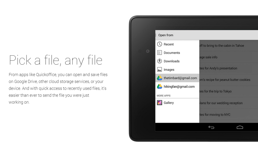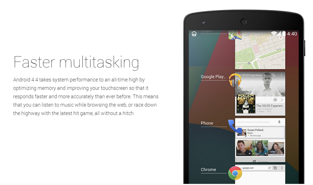Uno siempre quiere tener rápido acceso a lo que necesita, es por eso que KitKat optimiza la memoria y mejora la pantalla táctil para tener una respuesta más rápida y precisa. Esto significa que puedes escuchar música mientras juegas o navegas en Internet.