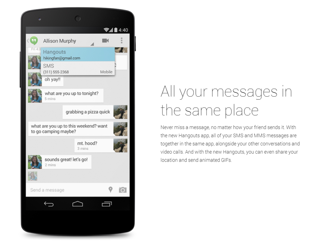 Uno ahora se comunica con otras personas por llamadas, videollamadas, chats. Para mantener todas estas conversaciones alineadas, la nueva aplicación de Hangouts centraliza todos los SMS, MMS y videollamadas. El teléfono ya no incluye un icono para los SMS, ahora ha sido integrado con Hangouts. De todas formas Android igual te permite cambiar el gestor de SMS determinado, así podrás descargar una aplicación de terceros para leer tus mensajes.