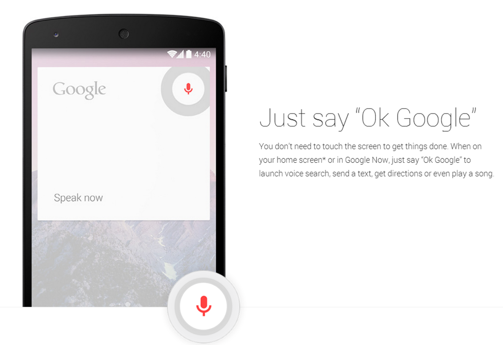 El comando de voz «OK Google» (visto en el Moto X y en otros smartphones) está disponible en KitKat. Una vez configurado, uno puede hablar con su dispositivo sin tener que tocarlo usando este comando. Le puedes preguntar por el clima, direcciones, cartelera del cine, resultados de deportes, que reproduzca una canción específica, enviar un SMS o hacer una llamada.