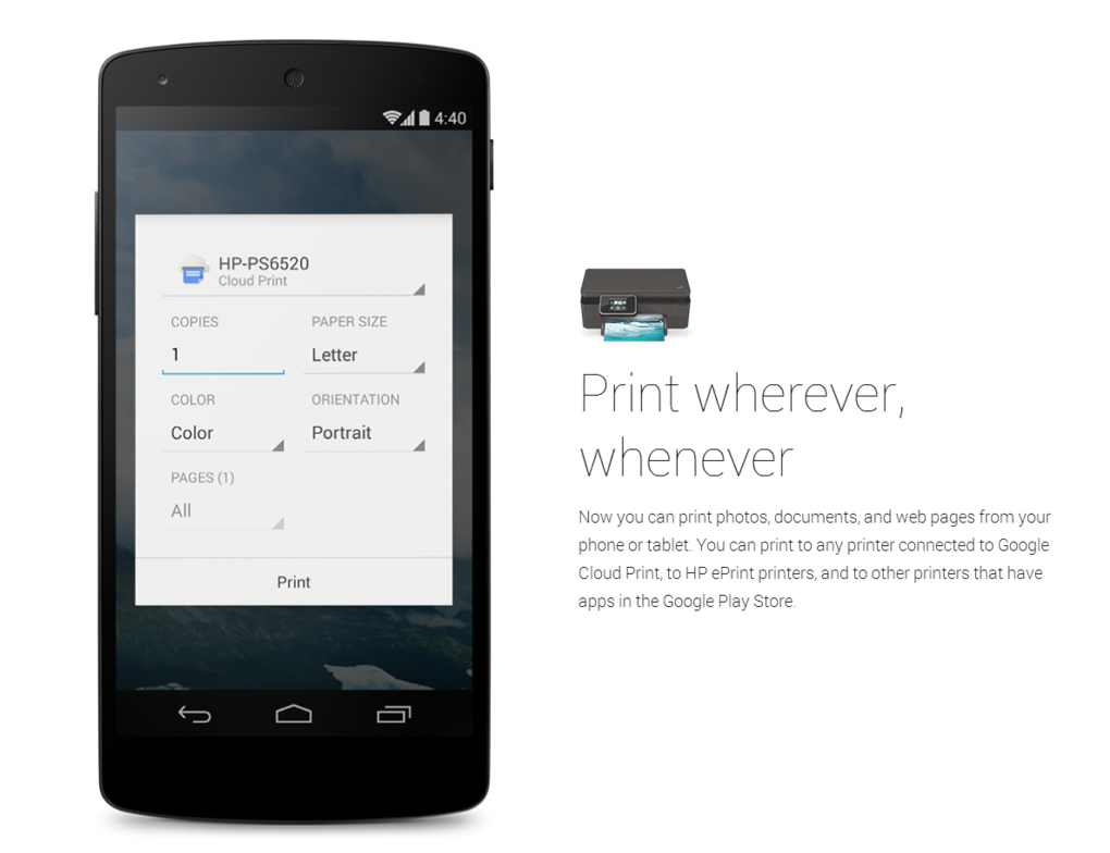 Imprimir desde un smartphone ahora es mucho más fácil debido a que ahora se puede imprimir en cualquier impresora conectada a Google Cloud Print, a las impresoras HP ePrint o a otras impresoras que tienen aplicaciones en la tienda Google Play.