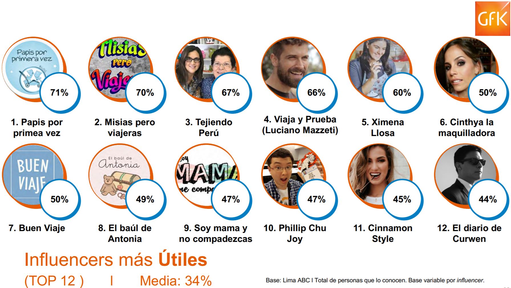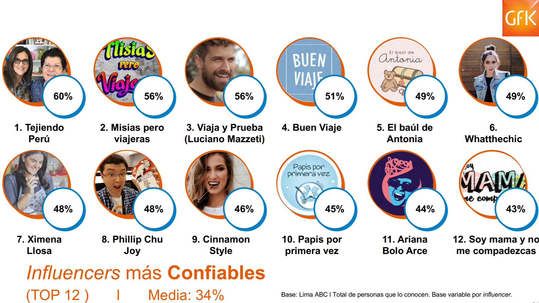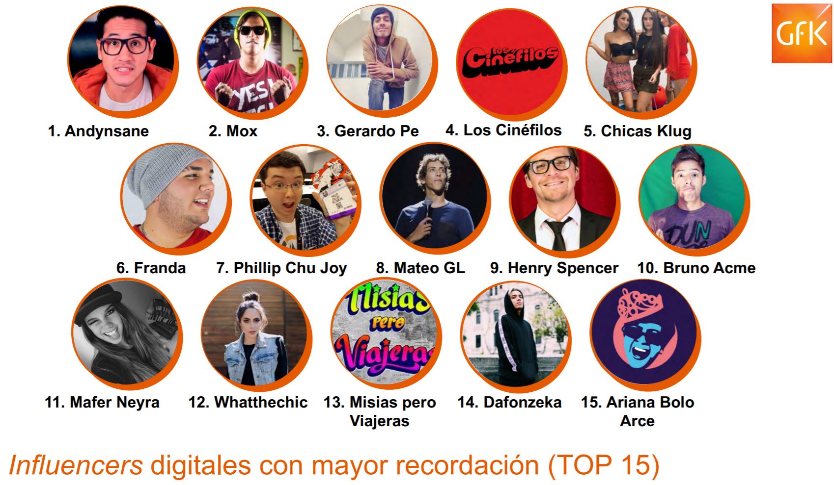Una reciente encuesta de la compañía de investigación GFK recopiló información acerca de los influencers digitales en Perú y de su posible impacto a nivel comercial. Se realizaron 915 encuestas a personas entre 15 a 50 años entre niveles los socioeconómicos A, B y C.