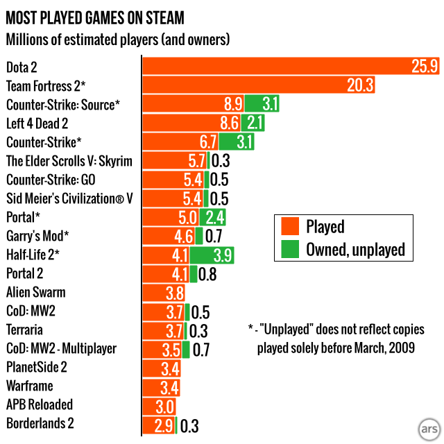 Con una biblioteca de más de 3000 títulos y 75 millones de usuarios activos, Steam es la plataforma de distribución de videojuegos en PC más grande e importante del mundo. Ars Technica recopiló la data de la plataforma y ha creado interesantes cuadros que nos muestran los juegos más comprados, los más jugados y el porcentaje de juegos que pasan en nuestra biblioteca olvidados. Cogieron perfiles al azar y han conseguido datos estadísticos con un margen de error de sólo 0.33 por ciento.