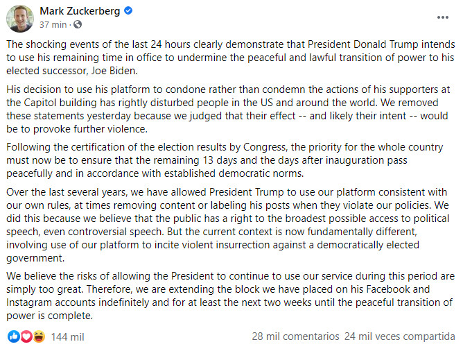 Si bien estas medidas ya se consideraban sin precedentes, Mark Zuckerberg las lleva a un nuevo nivel bloqueando de manera indefinida, y por al menos dos semanas, las cuentas de Trump hasta que se complete la transición de poderes hacia Joe Biden. El jefe de Facebook alega que el presidente planea usar el tiempo que le queda en mando para afectar al cambio pacífico y legal de mandato.