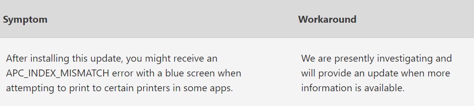 El error ocurre cuando intentamos imprimir con algunas impresoras en algunas aplicaciones. Microsoft ha confirmado que se encuentra investigando este desperfecto. Si deseas solucionar momentáneamente, puedes desinstalar las actualizaciones mencionadas mediante el panel de Windows Update y en la sección de “Desinstalar actualizaciones”.