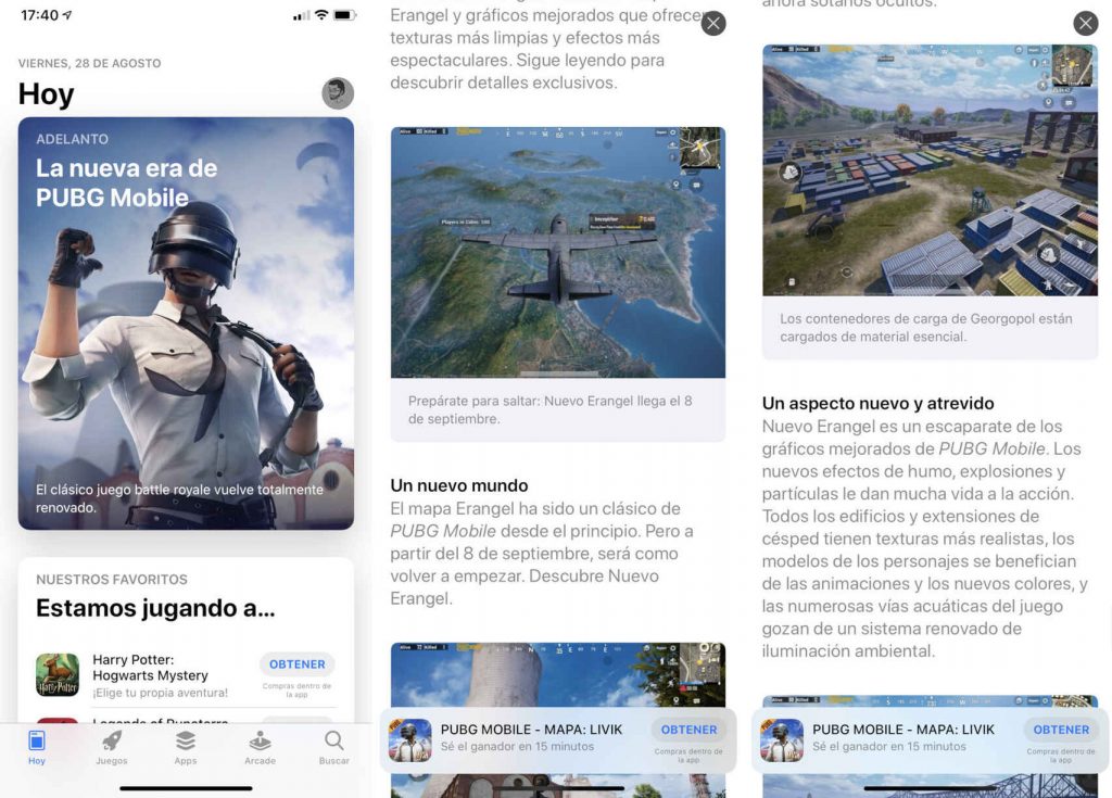 Ahora, si ingresas a la AppStore serás sorprendido con un gran banner promocional de PUBG. Si hacemos click nos trasladaremos a un amplio artículo el cual detalla todas las novedades de este juego en su nueva actualización. Se resalta que esta “nueva era” de PUBG se centra en atraer a nuevos jugadores con nuevos gráficos, mapas y nueva jugabilidad.