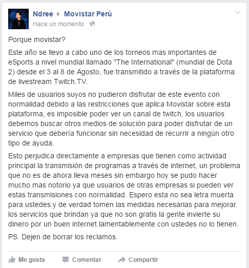 Los usuarios que eligieron seguir el evento por Twitch reportaron muchos problemas de conectividad con el servicio “Movistar”, ya que se rumoreaba que tenían una mala conexión para esta web haciendo que sea imposible usarla sin alguna extensión como Hola VPN para mejorar la calidad de la red. El comentarista profesional de Dota 2 André Santillán, se percató de este problema y manifestó su malestar mediante las redes sociales pero fue ignorado por la empresa.