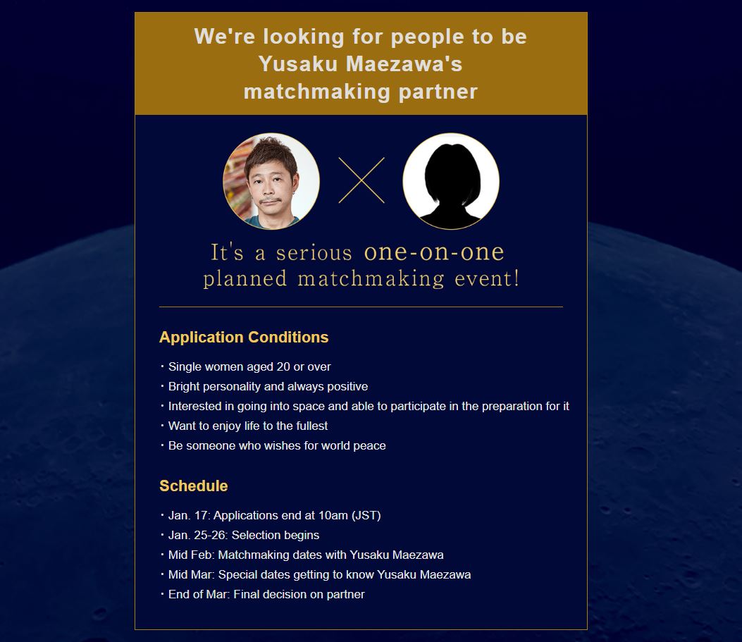 Esta búsqueda formará parte del documental llamado “Full Moon Lovers”, que será emitido en el servicio de straming japonés, Abema TV. El multimillonario de 44 años lanzó esta campaña desde su Twitter en la cual busca a una mujer mayor de 20 años con una “personalidad brillante” y que esté interesada en ir al espacio.