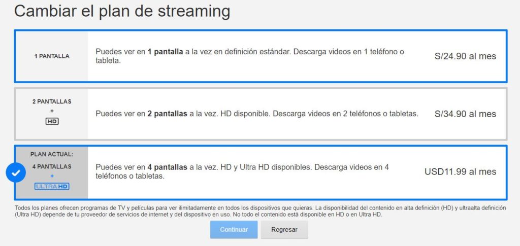 - Plan de 4 pantallas + Ultra HD: antes US$ 11,99, ahora será S/ 44,90