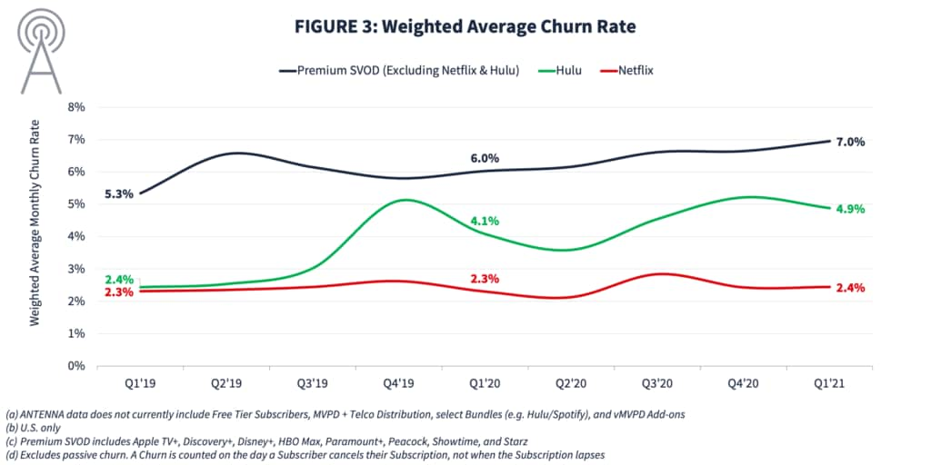 Según la investigación de la firma Antenna, Netflix es la plataforma que menos abandono posee con una tasa de apenas 2,4%. Esta cifra resulta bastante baja si la comparamos con los 4.9% y los 7.0% de Hulu y el resto de servicios de streaming (HBO Max, Amazon Prime Video, etc) respectivamente.