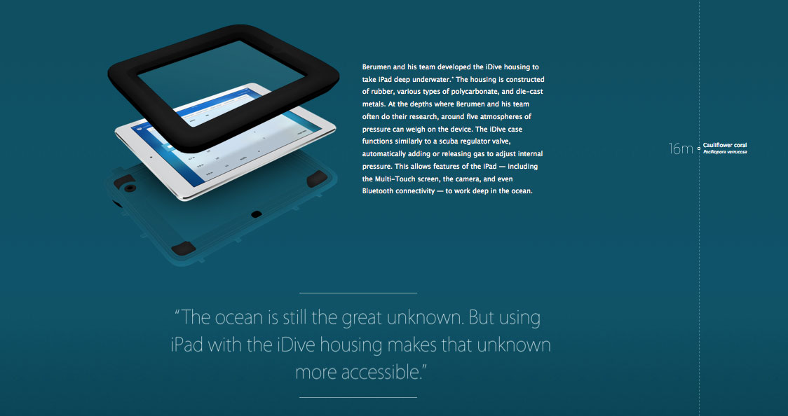 En la página web de Apple podemos ver información acerca de las historias que se muestran en emotivo comercial. Es así como podemos conocer como llevaron el conocido dispositivos a las profundidades del océano o a la altura de un nevado.