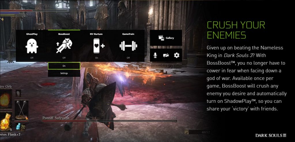 Además tiene un modo extra llamado BossBoost que te ayuda a vencer los jefes más difícil de juegos como Dark Souls 3. De esta forma el GeForce GTX G-Assist determina la manera más estilizada de vencerlos y te ayuda a grabar el mejor gameplay posible para se lo muestres a tus amigos. Por último calcula el tiempo exacto que tienes entre pantallas de carga y preparativos para que puedas ir al refrigerador a coger algo. Encima te avisa cuando tus bebidas se encuentran a la temperatura ideal para que las puedas tomar heladitas.